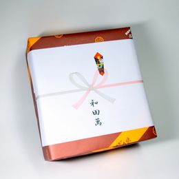 かごの中に入っている商品を和田萬スタッフがギフト包装いたします。