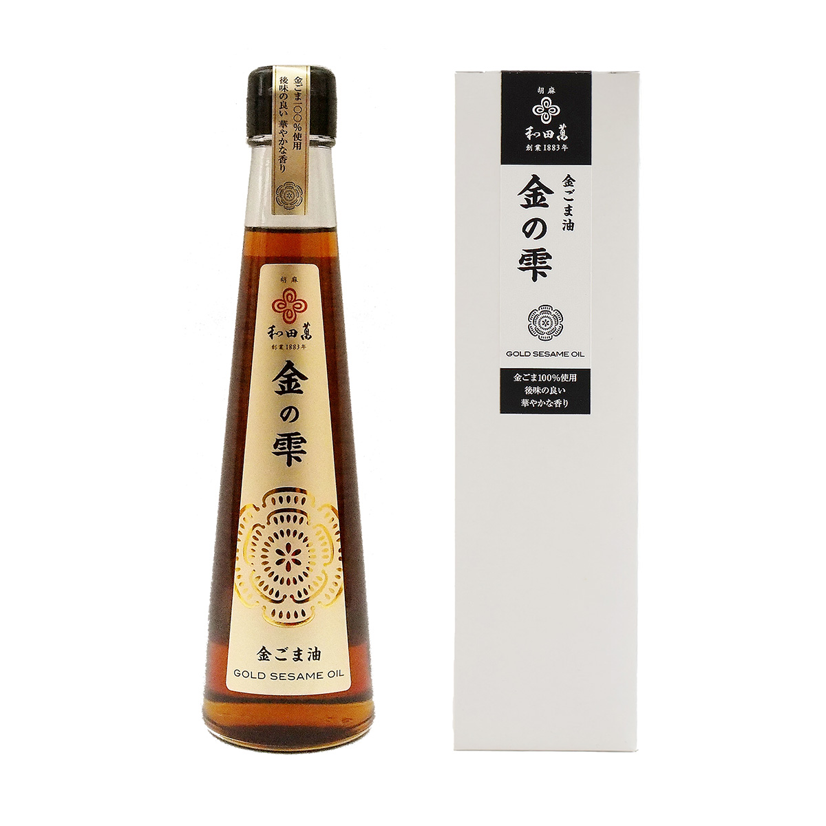 ごまの王様「金ごま」を丁寧に搾った香り高いごま油です。華やかな香りと濃厚なうまみ、豊かでコクのある風味が特徴です。 普段のお料理に香り付けとしてご利用いただけると、お料理の風味が何倍にも引き立ちます。 サラダやアイスクリームにかけてもおいしいです。