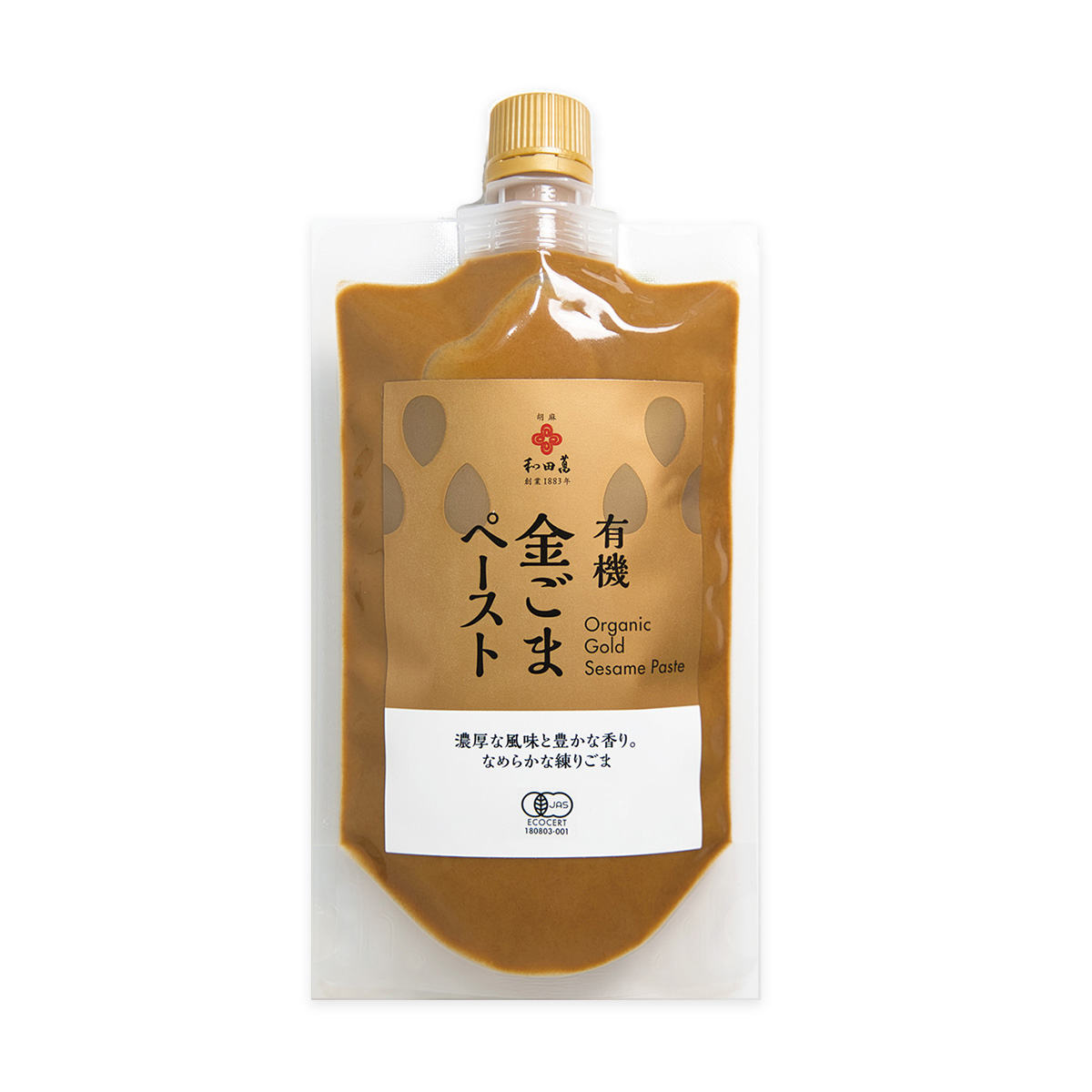 香りとうまみの上品さ濃厚さで世界中のシェフから愛される有機金ごまを和田萬伝統の焙煎技法で超高温で焙煎したあと、特別な臼(うす)で何回も丁寧につぶしてペースト状に仕上げました。芳醇なコクと官能的な香りが特徴です。ごまの栄養をまるごとお召し上がりください。